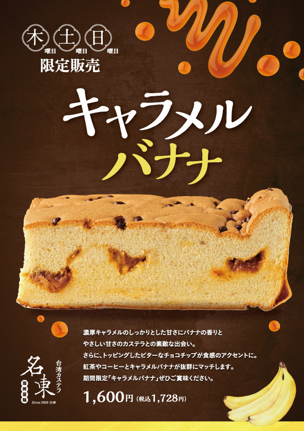 名東の5月限定販売商品は「キャラメルバナナ」です 濃厚キャラメルのしっかりとした甘さに、バナナの香りと優しい甘さのカステラが出会いました さらにトッピングのビターチョコチップが食感のアクセントに 紅茶やコーヒーとキャラメルバナナが抜群にマッチします